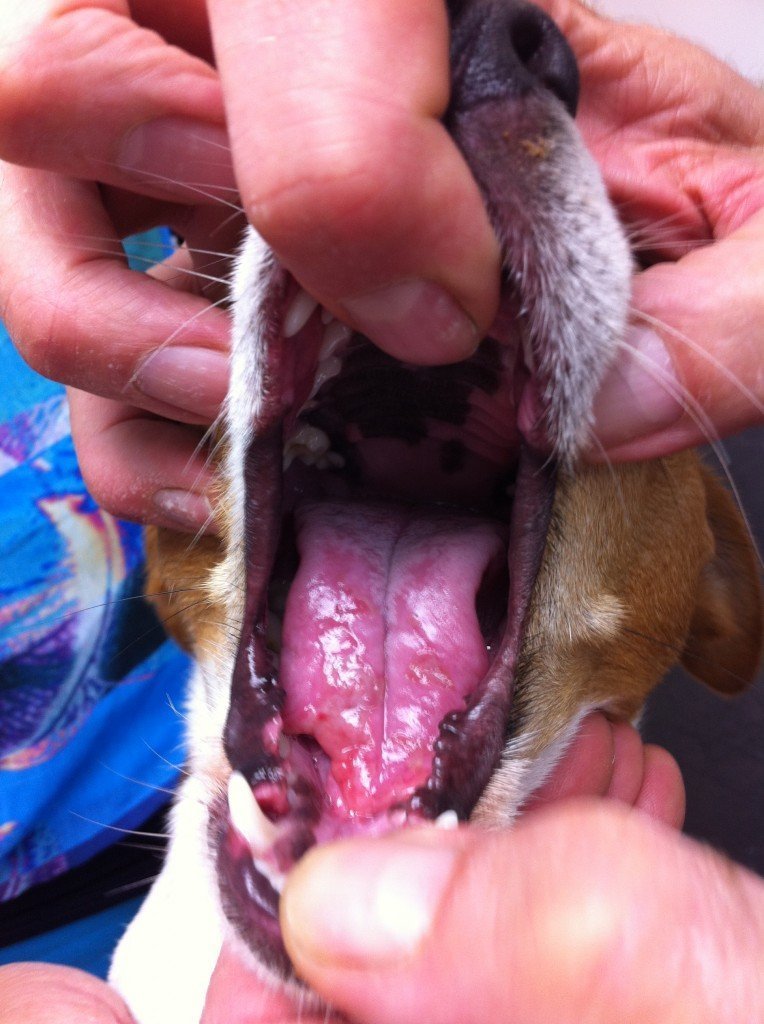 Maar een dag later was Jacky nog zieker. Ze had nog steeds geen hap gegeten, gaf vocht uit haar maag op en had milde symptomen van uitdroging. Haar tong was nog meer gezwollen en het voorste deel was over een oppervlak van 4 cm2 blauw/paars. Het was voor de eigenaar ondoenlijk om de medicatie toe te dienen, daarvoor was Jacky’s bekje te pijnlijk. We besloten Jacky op te nemen en aan een infuus te leggen. Daarmee werd behalve vocht ook de medicatie toegediend. Zo zou ze in elk geval niet uitdrogen.